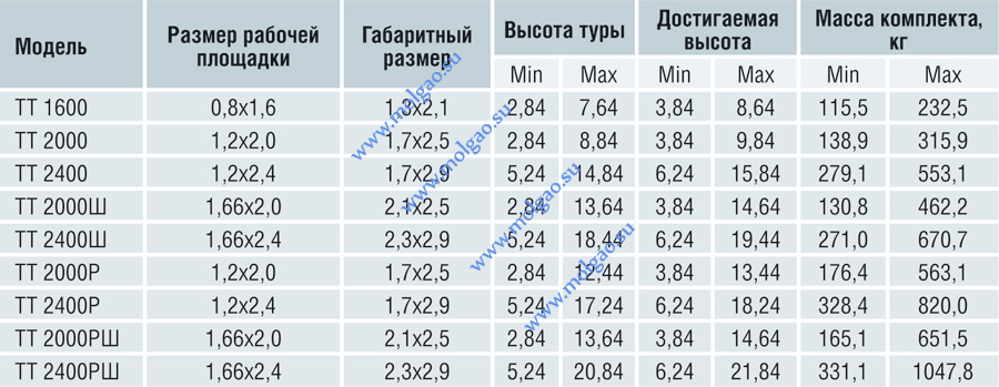 Нагрузка на рабочую площадку не должна быть больше 250 кг. Вышка тура ТТ 1600 является более легким и более компактным вариантом. Линейка насчитывает пять однотипных изделий разной высоты (от 2, 84 до 7, 64). Вышки-туры серии ТТ 2000 применяют в крупных торговых центрах для профилактических работ под крышей. В серию входят шесть вышек различной высоты (от 2, 84 до 8, 84). Серия вышек-тур ТТ 2400 включает девять типоразмеров (от 5, 24 до 14, 84 м высотой). Серия ТТ 2000Ш отличается от другой продукции более широкой рабочей площадкой и большей высотой. Вышки большей высоты (от 12, 44 м) снабжены колесами с полиуретановым покрытием. В серию входят десять типов изделий различной высоты (от 2, 84 м до 13, 64 м). Изделия серии ТТ 2400Ш имеют еще больший размер рабочей площадки. Серия насчитывает 12 видов изделий, высота которых возрастает с шагом в 1, 2 м от 5, 24 м (наименьшая) до 18, 44 м (наибольшая в серии). Серия ТТ 2000Р предназначена для применения в помещениях с ограниченным грузовым проемом. Так, изделия данной серии можно применять в нефтеналивных резервуарах диаметром в 60 см, в химических терминалах, силосах и т.п. При этом максимальный поперечный размер деталей туры составляет 58 см. Самая маленькая вышка данной серии может применяться в помещениях с проходом размером с канализационный люк. В серию входят девять типов изделий высотой от 2, 84 до 12, 44 м. Вышки-туры ТТ 2400Р схожи по характеристикам с продукцией серии ТТ 2000Р, но имеют больший размер рабочей площадки. Серия включает 11 размерностей от 5, 24 м до 17, 24 м. Продукция серий ТТ 2000РШ и ТТ 2400РШ сочетает в себе достоинства двух предыдущих групп. К первой серии относятся вышки-туры высотой от 2, 84 м до 13, 64 м (10 размеров) с рабочей площадкой 1, 66х2 м, ко второй - изделий высотой 5, 24-20, 84 м (14 размеров) с рабочей площадкой 1, 66х2, 4 м.