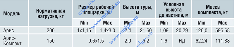 Таблица 8. Технические характеристики вышек-тур ГК "Арис". Источник: ABARUS Market Research по данным компании.