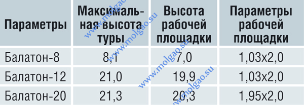 Модель "Балатон-8" - облегченная конструкция, предназначенная для подъема груза на высоту до восьми метров. Грузоподъемность модели составляет 200 кг на площадку. "Балатон-12" могут применяться при проведении ремонтных и строительных работ на большей высоте - до 21 м. В пределах 13 м тура является самостоящей и, по данным компании, не требует крепления к стене. "Балатон-20" является наиболее "мощной" из всей изготавливаемой продукции. Грузоподъемность конструкции составляет 400 кг на площадку.